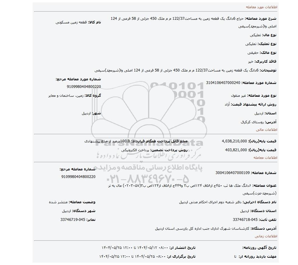 عنوان معامله: ۶دانگ ملک ها ثب ۴۵۰ج از۵۸ف ۱۲۴اص ب۳ و۴۴۹ج از۵۸ف از۱۲۴اص ب۳(۰۲۰۳۰۵۷) مال به تر (شیرمحمد-عزت)سیفی | ||