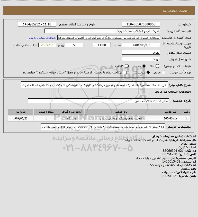 شرح کلی نیاز: خرید خدمات مشاوره راه اندازی، توسعه و تجهیز درمانگاه و کلینیک دندانپزشکی شرکت آب و فاضلاب استان تهران