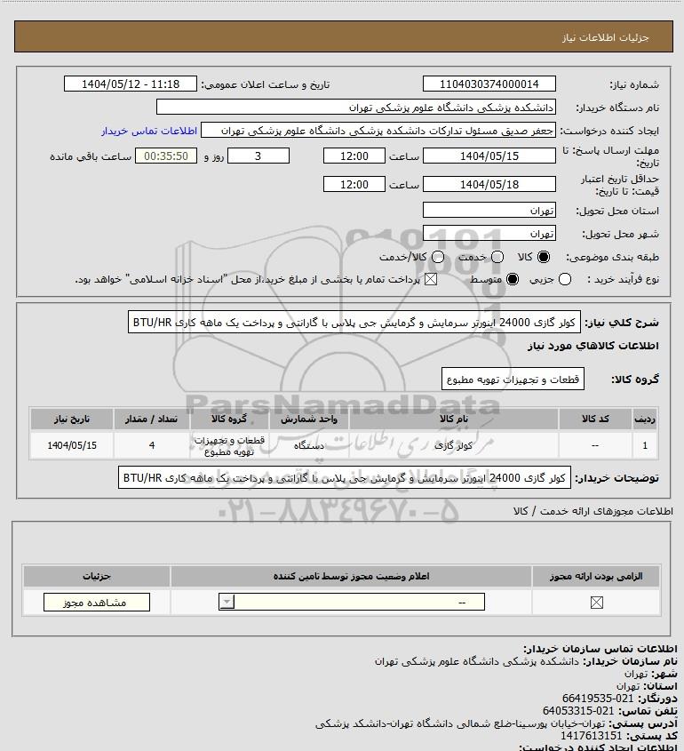 | 1 | -- | کولر گازی | دستگاه | قطعات و تجهیزات تهویه مطبوع | 4 | 1404/05/15 |