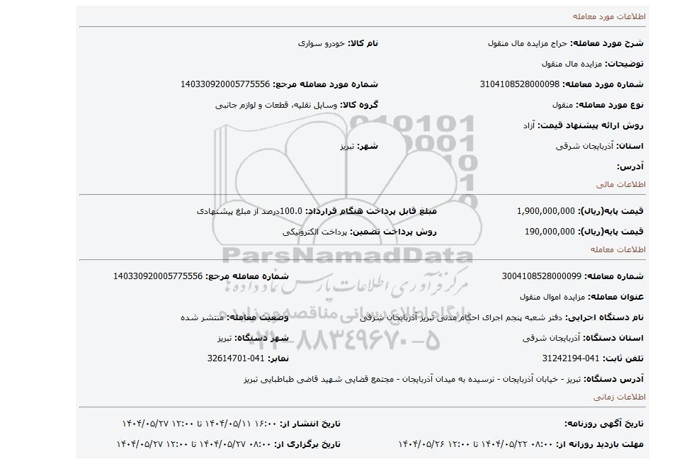 | نام دستگاه اجرایی: دفتر شعبه پنجم اجرای احکام مدنی تبریز آذربایجان شرقی | وضعیت معامله: منتشر شده | |