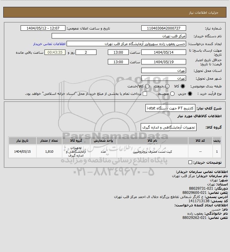 استعلام کارتریج PT جهت دستگاه i-stat, استعلام کارتریج PT جهت دستگاه i-stat