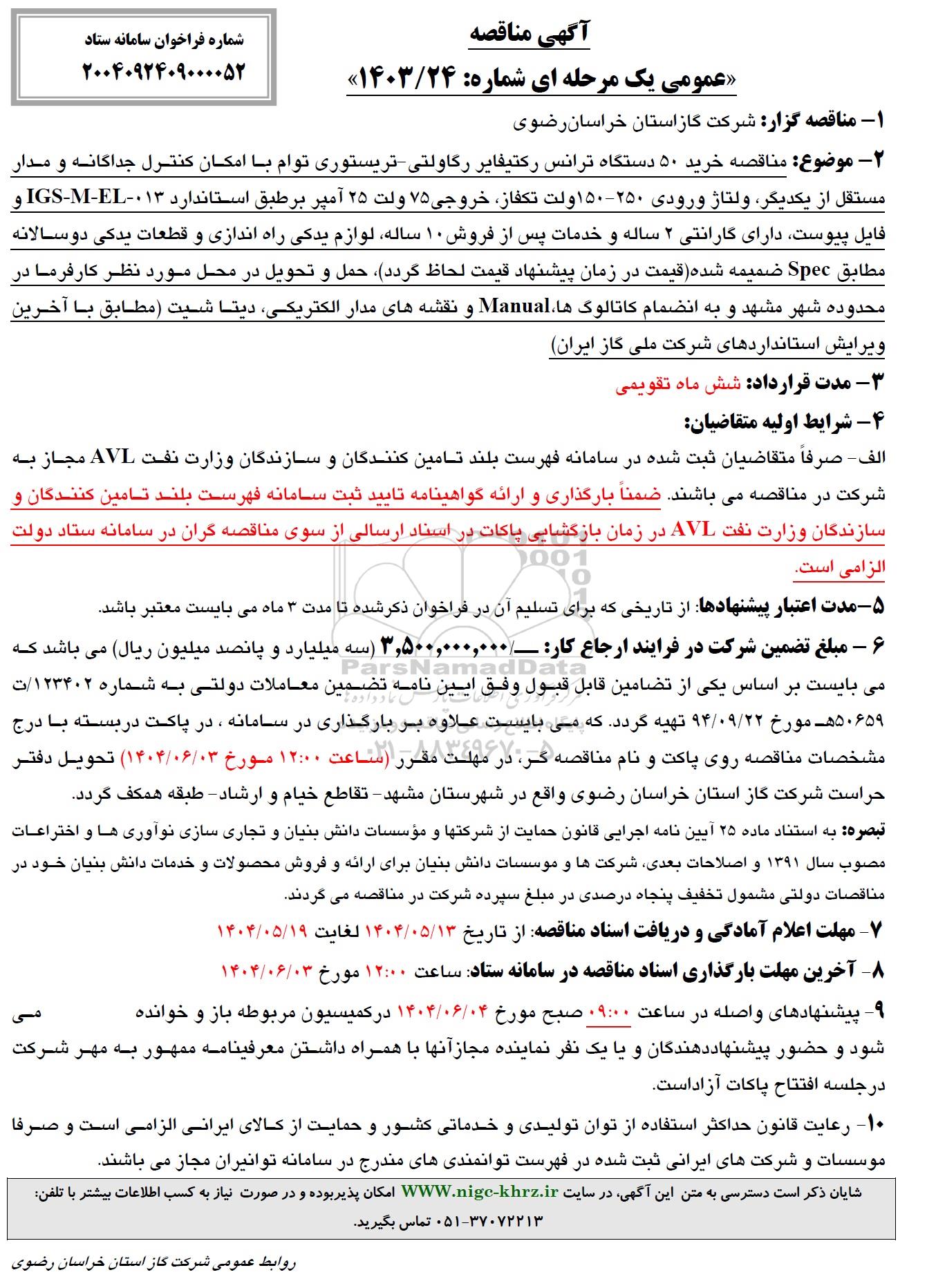 2- موضوع مناقصه : خرید 50 دستگاه ترانس رکتیفایر رگاولتی - تریستوری توام با امکان کنترل جداگانه و مدار مستقل از یکدیگر ولتاژ ورودی  250-150 ولت تکفاز ، خروجی 75 ولت 25 آمپر بر طبق استاندارد 013-IGS-M-EL و فایل پیوست دارای گارانتی 2 ساله و خدمات پس از فروش 10 ساله، لوازم یدکی راه اندازی و قطعات یدکی دو سالانه مطابق Spec ضمیمه شده قیمت در زمان پیشنهاد قیمت لحاظ گردد )،حمل و تحویل در محل مورد نظر کارفرما در محدوده شهر مشهد و به انضمام کاتالوگ ها، Manual و نقشه های مدار الکتريکی، ديتا شيت (مطابق با آخرین ویرایش استانداردهای شرکت ملی گاز ایران)