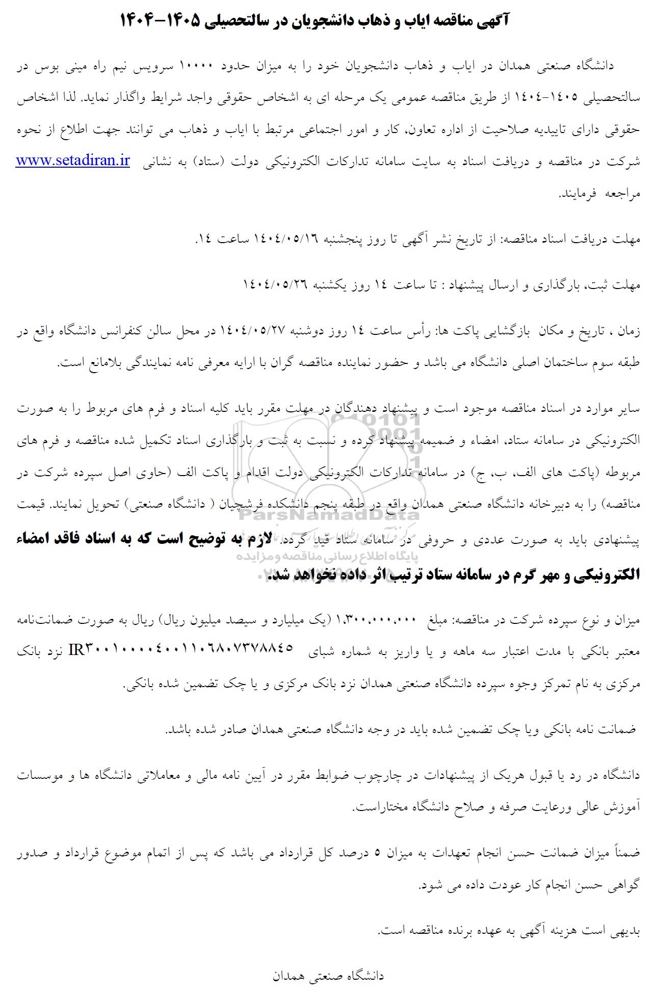 دانشگاه صنعتی همدان در ایاب و ذهاب دانشجویان خود را به میزان حدود 10000 سرویس نیم راه مینی بوس در سال تحصیلی 1405-1404 از طریق مناقصه عمومی یک مرحله ای به اشخاص حقوقی واجد شرایط واگذار نماید. لذا اشخاص حقوقی دارای تاییدیه صلاحیت از اداره تعاون کار و امور اجتماعی مرتبط با ایاب و ذهاب میتوانند جهت اطلاع از نحوه شرکت در مناقصه و دریافت اسناد به سایت سامانه تدارکات الکترونیکی دولت (ستاد) به نشانی ستاد ایران مراجعه فرمایند.