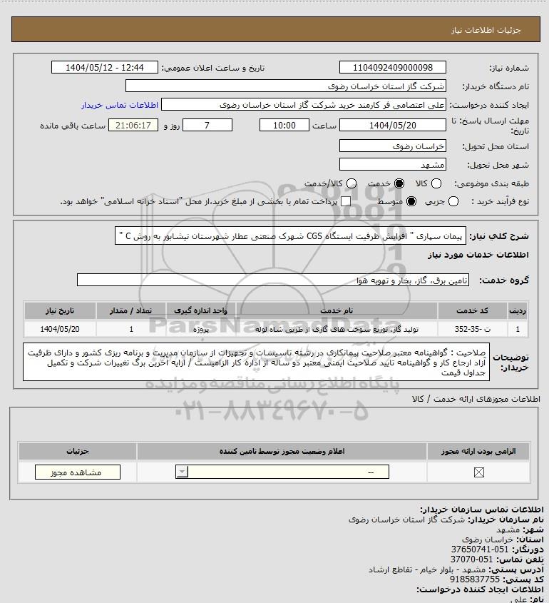 شرح کلی نیاز: پیمان سپاری " افزایش ظرفیت ایستگاه CGS شهرک صنعتی عطار شهرستان نیشابور به روش C "