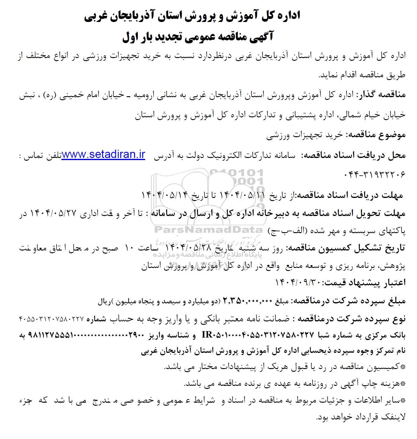 اداره کل آموزش و پرورش استان آذربایجان غربی در نظر دارد نسبت به خرید تجهیزات ورزشی در انواع مختلف از طریق مناقصه اقدام نماید.