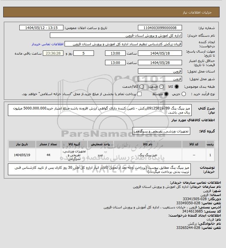 شرح کلی نیاز: میز پنیگ پنگ 09125819789زرکش - تامین کننده دارای گواهی ارزش افزوده باشد-مبلغ اعتبار خرید5000.000.000 میلیون ریال می باشد.