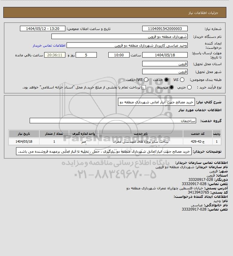 شرح کلی نیاز: خرید مصالح جهت انبار امانی شهرداری منطقه دو