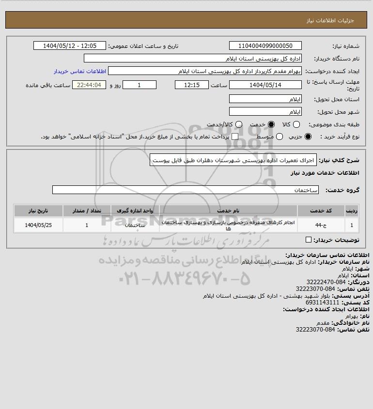 شرح کلی نیاز: اجرای تعمیرات اداره بهزیستی شهرستان دهلران طبق فایل پیوست