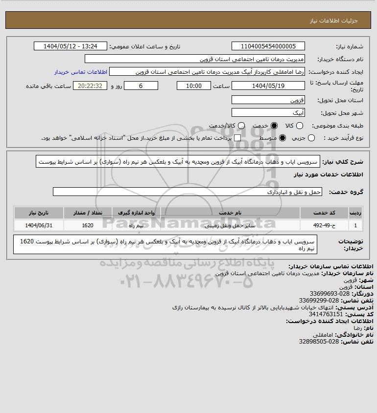 استعلام سرویس ایاب و ذهاب درمانگاه آبیک از قزوین ومحمدیه به آبیک و بلعکس هر نیم راه (سواری) بر اساس شرایط پیوست, استعلام سرویس ایاب و ذهاب درمانگاه آبیک از قزوین ومحمدیه به آبیک و بلعکس هر نیم راه (سواری) بر اساس شرایط پیوست