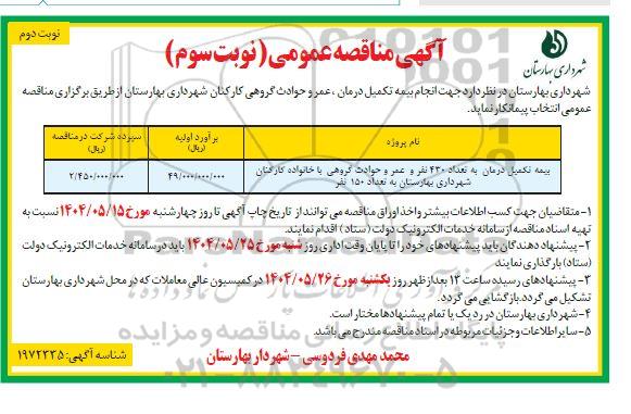 شهرداری بهارستان در نظر دارد جهت انجام بیمه تکمیل درمان ، عمر و حوادث گروهی کارکنان شهرداری بهارستان از طریق برگزاری مناقصه عمومی انتخاب پیمانکار نماید.