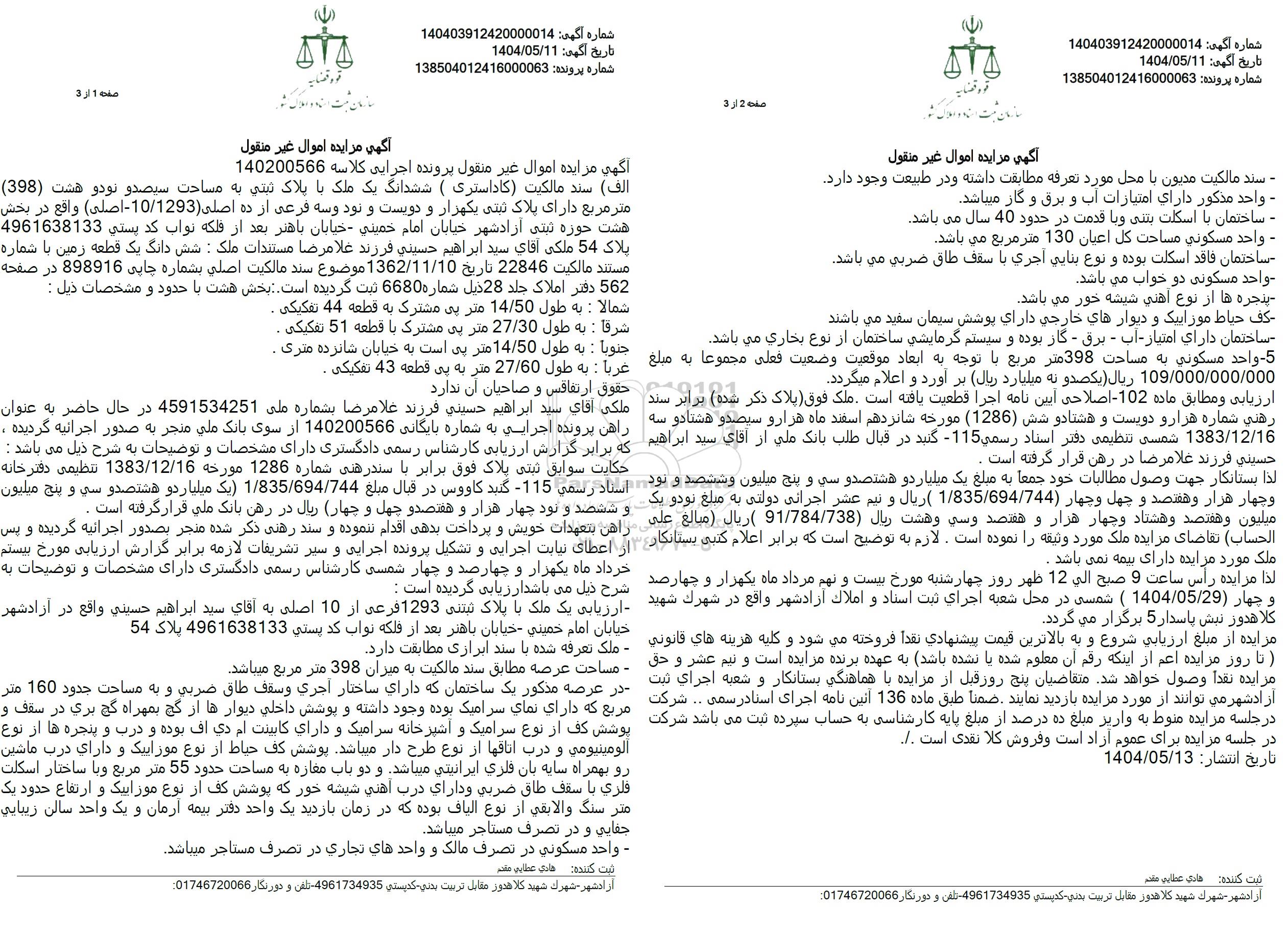 مزایده فروش ششدانگ یک ملک به مساحت 398 مترمربع با پلاک ثبتی 1293 فرعی از 10 اصلی