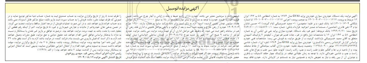 تاریخ مزایده: از ساعت 9 صبح الی 12 ظهر روز شنبه مورخ 1404.05.25