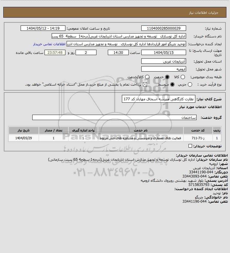 شرح کلی نیاز: نظارت کارگاهی مدرسه اسحاق مهاباد کد 177