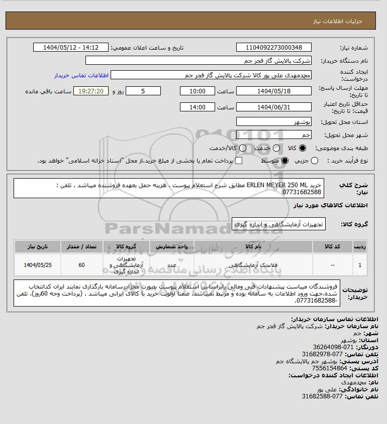 شرح کلی نیاز: خرید ERLEN MEYER 250 ML مطابق شرح استعلام پیوست . هزینه حمل بعهده فروشنده میباشد . تلفن : 07731682588