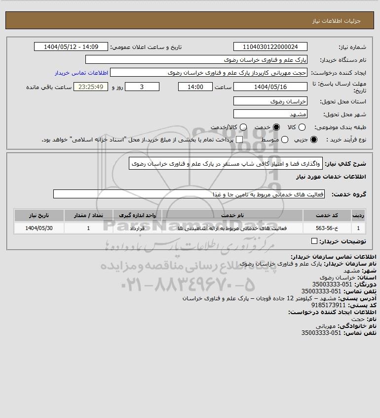 شرح کلی نیاز: واگذاری فضا و امتیاز کافی شاپ مستقر در پارک علم و فناوری خراسان رضوی