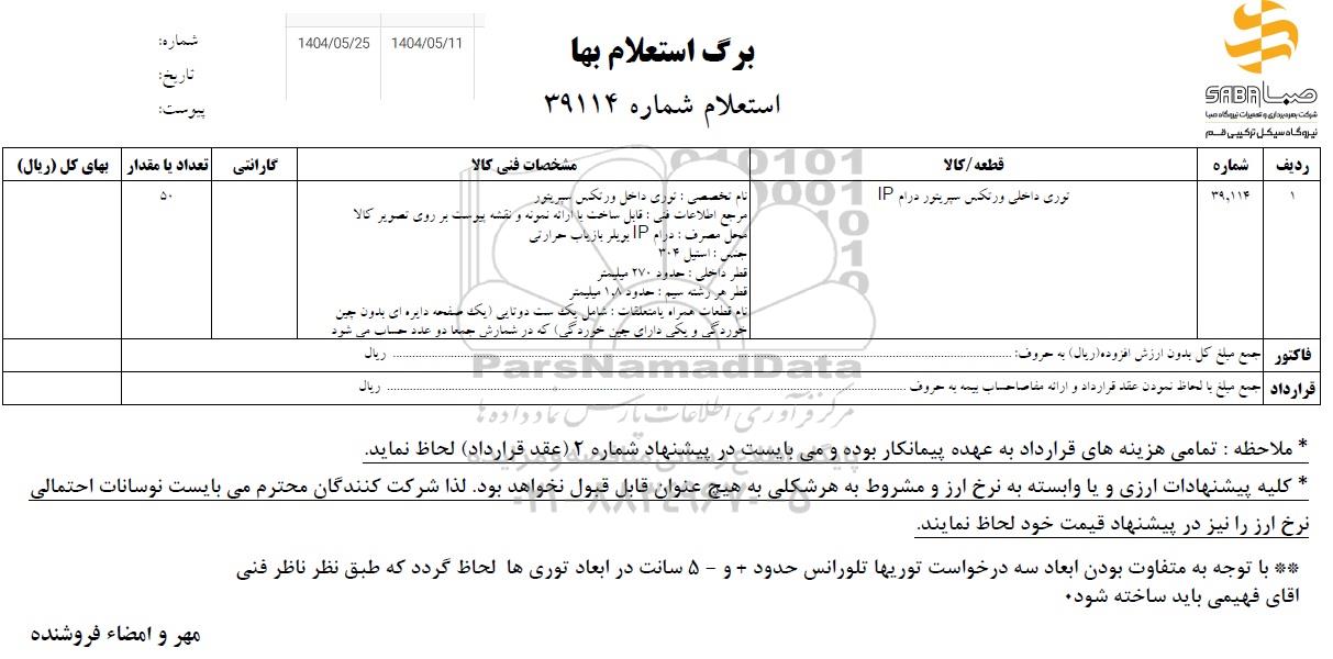 استعلام بها و موضوع استعلام استعلام توری داخلی ورتکس سپریتور درام ip به اطلاع کلیه شرکتها و افراد متخصص واجد شرایط میرساند، آگهی گذار در نظر دارد از طریق استعلام بها، نسبت به انتخاب و دریافت پیشنهادات اقدام نماید. این استعلام با کد آگهی ثبت شده در سامانه خبرگزاری پارس نماد : 9360669 منتشر شده است. مشخصات استعلام : تاریخ شروع استعلام: 1404/05/12 آخرین مهلت ارسال پیشنهاد قیمت : 1404/05/25 و محل اجرای پروژه : استان قم میباشد. استعلام قیمت مورد درخواست : استعلام توری داخلی ورتکس سپریتور درام ip با دستهبندیهای تخصصی و گروه های مرتبط : صنایع مفتولی, نیروگاه, تجهیزات برق و الکترونیک, استعلام اطلاع رسانی میگردد. شرایط شرکت در استعلام آنلاین : ابتدا ثبت نام در سامانه استعلام پارس نماد و تکمیل مدارک موردنیاز و بارگذاری در سامانه رعایت تمامی ضوابط و الزامات مندرج در اسناد استعلام است.