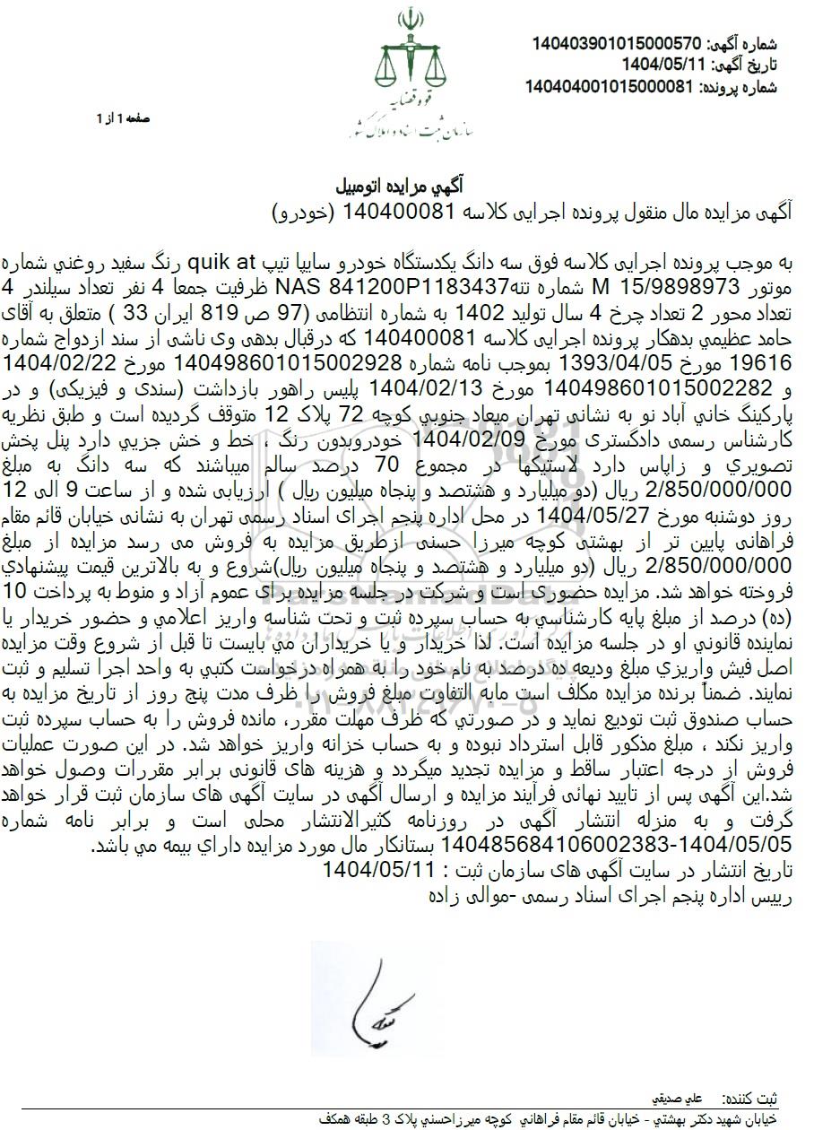 مزایده سه دانگ یک دستگاه خودرو سایپا تیپ quik at رنگ سفید روغنی