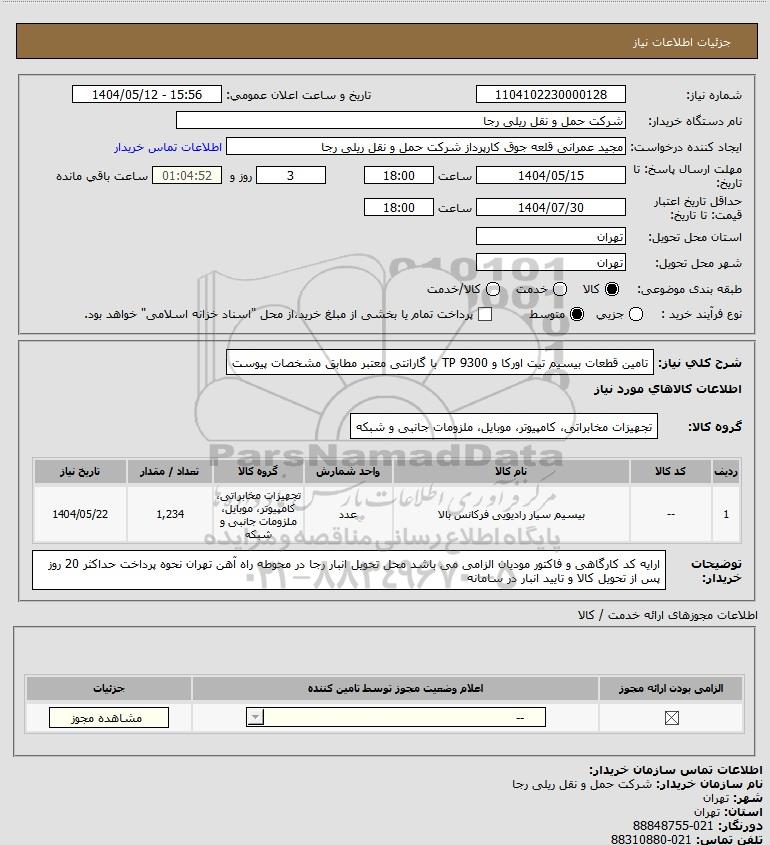 شرح کلی نیاز: تامین قطعات بیسیم تیت اورکا و TP 9300 با گارانتی معتبر مطابق مشخصات پیوست