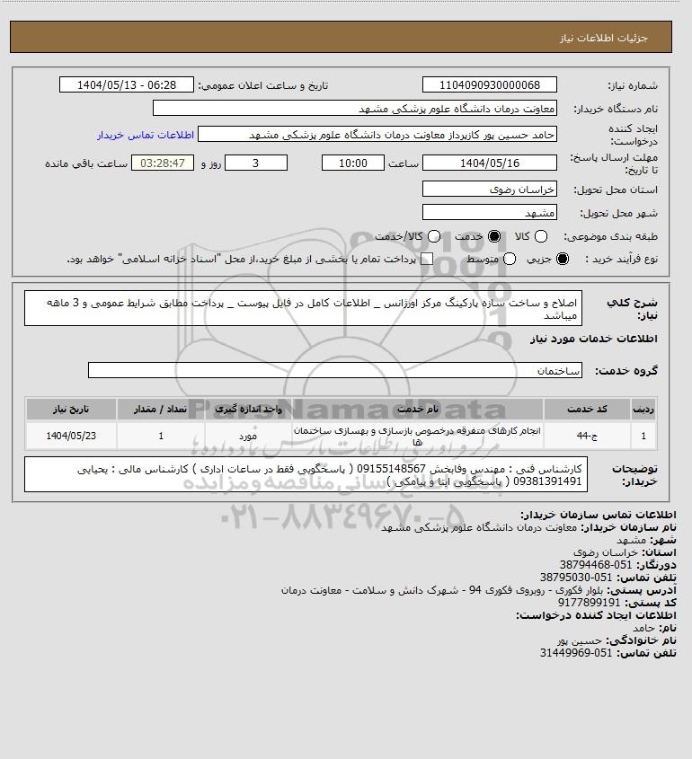 شرح کلی نیاز: اصلاح و ساخت سازه پارکینگ مرکز اورژانس _ اطلاعات کامل در فایل پیوست _ پرداخت مطابق شرایط عمومی و 3 ماهه میباشد