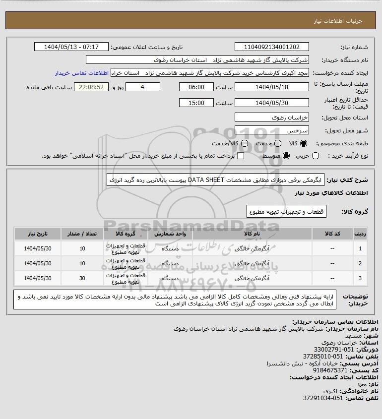 نام دستگاه خریدار:شرکت پالایش گاز شهید هاشمی نژاد استان خراسان رضوی