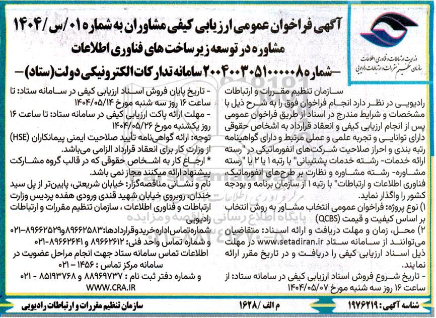 آگهی فراخوان عمومی ارزیابی کیفی مشاوران به شماره 01/ س/ 1404 مشاوره در توسعه زیرساخت های فناوری اطلاعات