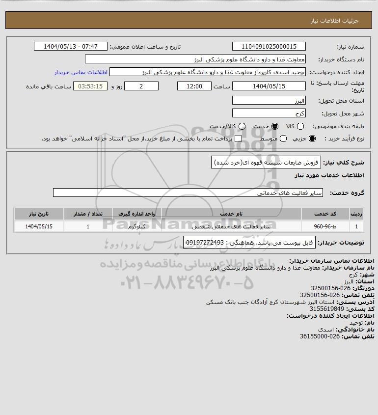 مزایده عمومی استعلام فروش ضایعات شیشه قهوه ای(خرد شده) برگزار میگردد. از کلیه افراد متخصص و شرکتهای واجد شرایط دعوت به عمل میآید تا در این مزایده با کد خبرگزاری پارس نماد : 9361886 شرکت نمایند تاریخ شروع مزایده : 1404/05/13 مهلت شرکت در مزایده: تا پایان روز 1404/05/15