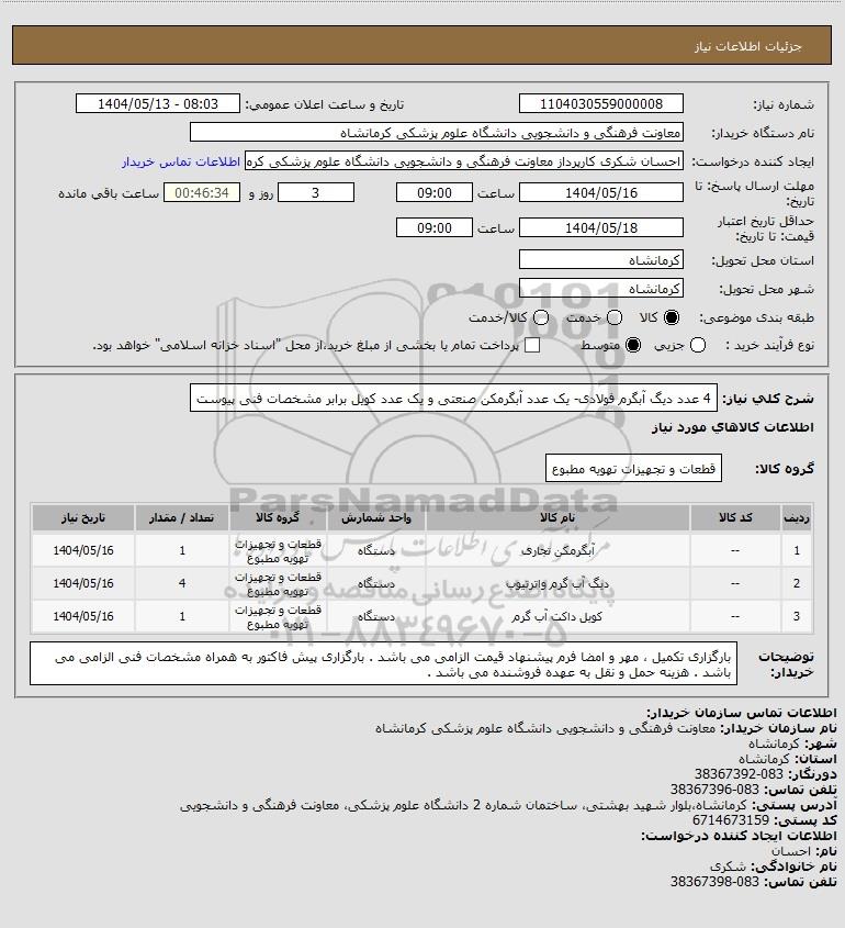 شرح کلی نیاز: 4 عدد دیگ آبگرم فولادی- یک عدد آبگرمکن صنعتی و یک عدد کویل برابر مشخصات فنی پیوست