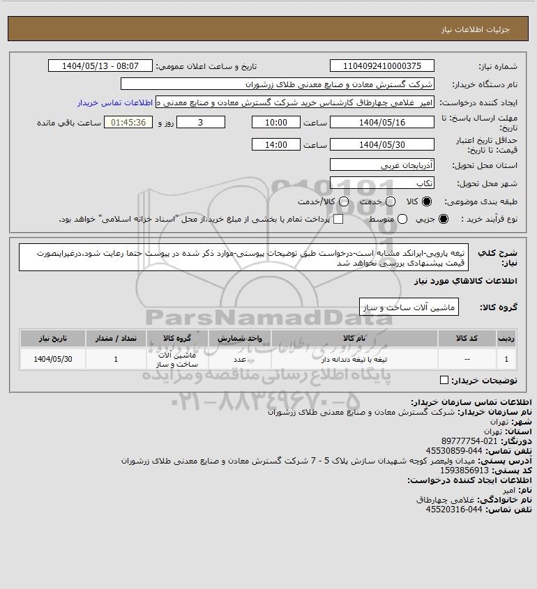 نام دستگاه خریدار:شرکت گسترش معادن و صنایع معدنی طلای زرشوران