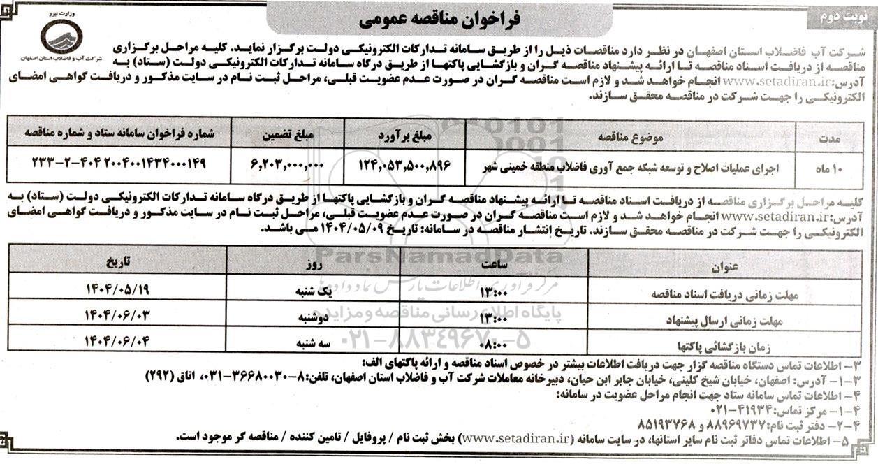 | 10 ماه | اجرای عملیات اصلاح و توسعه شبکه جمع آوری فاضلاب منطقه خمینی شهر | 124.053.500.896 | 6.203.000.000 | 233-2-404 2004001434000149 |