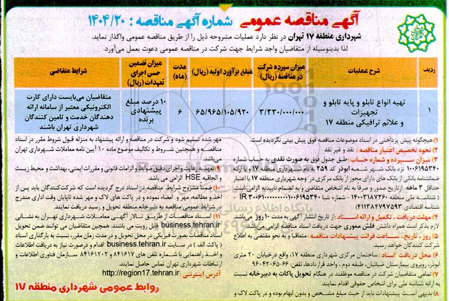 | 1 | تهیه انواع تابلو و پایه تابلو و تجهیزات و علائم ترافیکی منطقه 17 | 3.330.000.000 | 65.965.105.920 | 6 | 10 درصد مبلغ پیشنهادی برنده | متقاضیان میبایست دارای کارت الکترونیکی معتبر از سامانه ارائه دهندگان خدمت و تامین کنندگان شهرداری تهران باشند |