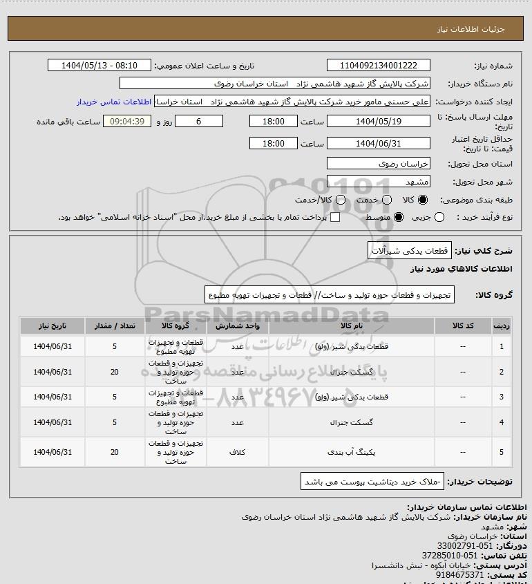 نام دستگاه خریدار:شرکت پالایش گاز شهید هاشمی نژاد استان خراسان رضوی