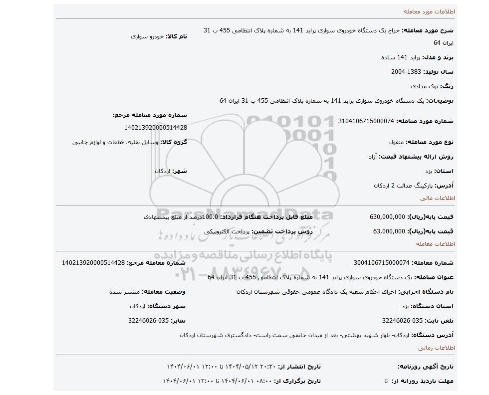 عنوان معامله: یک دستگاه خودروی سواری پراید 141 به شماره پلاک انتظامی 455 ب 31 ایران 64
