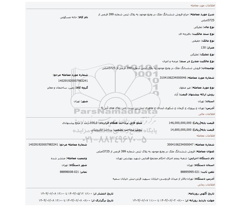 | شماره مورد معامله: 3104106234000046 | شماره مورد معامله مرجع: 140291920007983241 | |