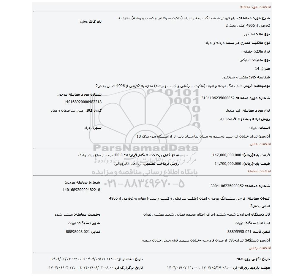 | شرح مورد معامله: حراج فروش ششدانگ عرصه و اعیان (ملکیت سرقفلی و کسب و پیشه) مغازه به 2فرعی از 4906 اصلی بخش2 | نام کالا: مغازه | |