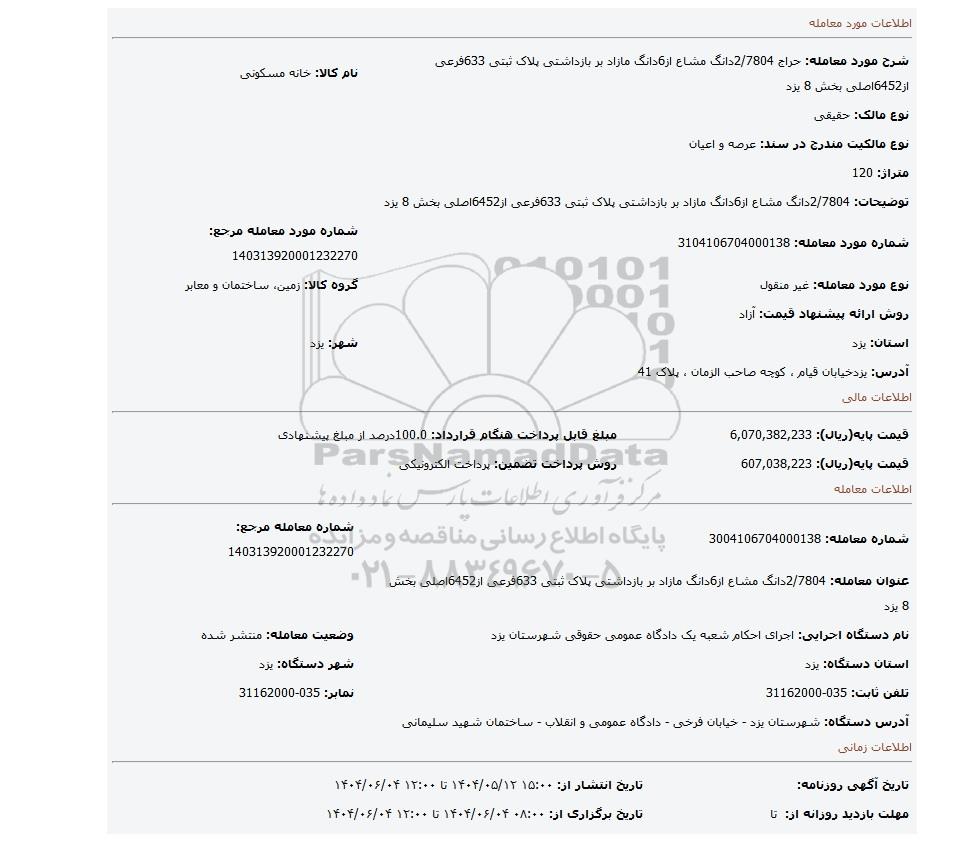 | عنوان معامله: 2/7804دانگ مشاع از6دانگ مازاد بر بازداشتی پلاک ثبتی 633فرعی از6452اصلی بخش 8 یزد | ||