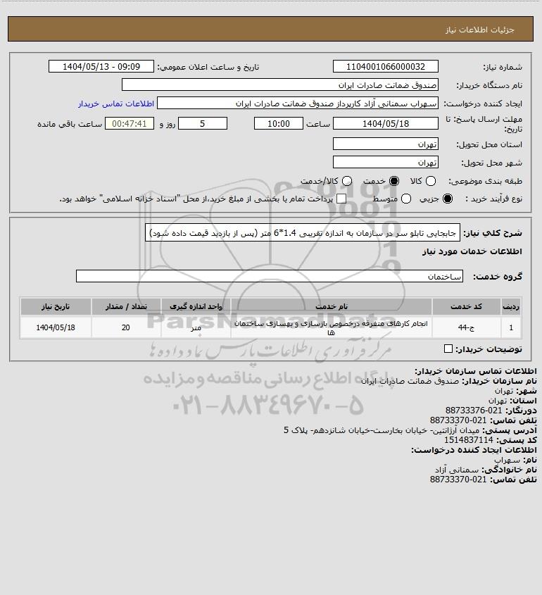 شرح کلی نیاز: جابجایی تابلو سر در سازمان به اندازه تقریبی 1.4*6 متر (پس از بازدید قیمت داده شود)