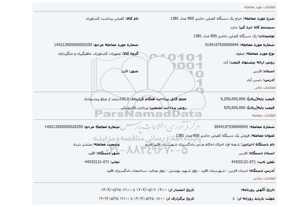 | عنوان معامله: فروش یک دستگاه کمباین جاندیر 955 مدل 1381 | ||
