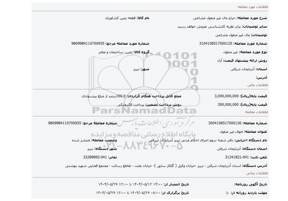 | شرح مورد معامله: حراج مال غیر منقول مشاعی | نام کالا: قطعه زمین کشاورزی | |