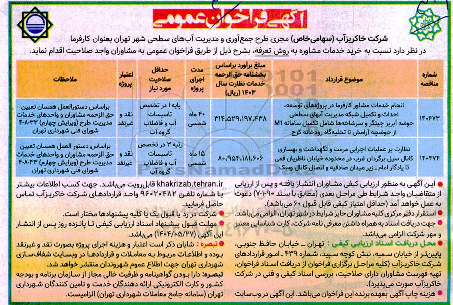 شرکت خاکریز آب (سهامی خاص) مجری طرح جمع آوری و مدیریت آبهای سطحی شهر تهران بعنوان کارفرما در نظر دارد نسبت به خرید مشاوره به روش تعرفه، بشرح ذیل از طیق فراخوان عمومی به مشاوران واجد صلاحیت اقدام نماید