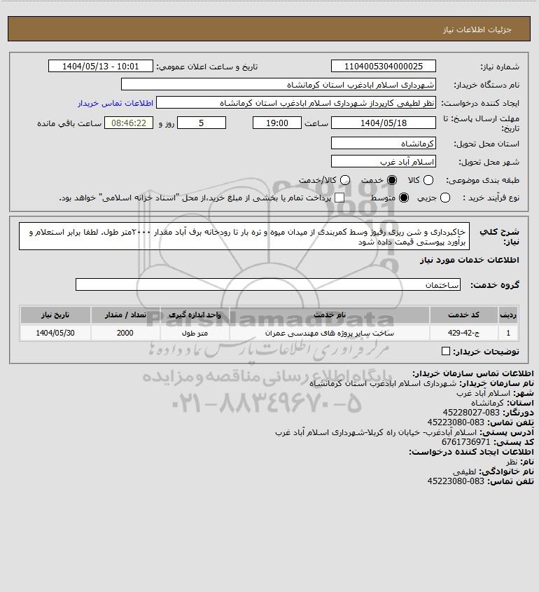 شرح کلی نیاز: خاکبرداری و شن ریزی رفیوژ وسط کمربندی از میدان میوه و تره بار تا رودخانه برف آباد مقدار ۲۰۰۰متر طول. لطفا برابر استعلام و برآورد پیوستی قیمت داده شود