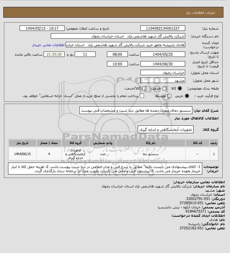 نام دستگاه خریدار:شرکت پالایش گاز شهید هاشمی نژاد استان خراسان رضوی