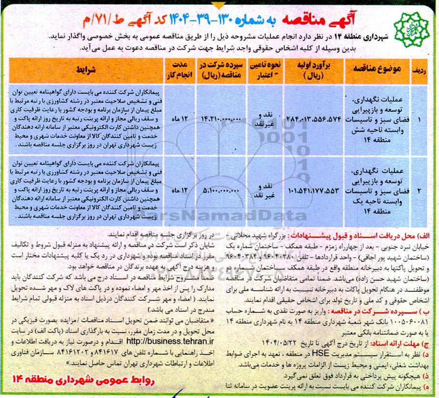 1 عملیات نگهداری، توسعه و بازپیرایی فضای سبز و تاسیسات وابسته ناحیه شش منطقه 14 284.013.556.574 نقد و غیر نقد 14.510.000.000 12 ماه پیمانکاران شرکت کننده می بایست دارای گواهینامه تعیین توان فنی و تشخیص صلاحیت معتبر در رشته کشاورزی با رتبه مرتبط با مبلغ پیمان از سازمان برنامه و بودجه کشور با رعایت ظرفیت کاری و سقف ریالی مجاز و ارائه پرینت رتبه به تاریخ روز ارائه پاکت و همچنین داشتن کارت الکترونیکی معتبر از سامانه ارائه دهندگان خدمت و تامین کنندگان کالا از معاونت خدمات شهری و محیط زیست شهرداری تهران در روز برگزاری جلسه مناقصه باشند