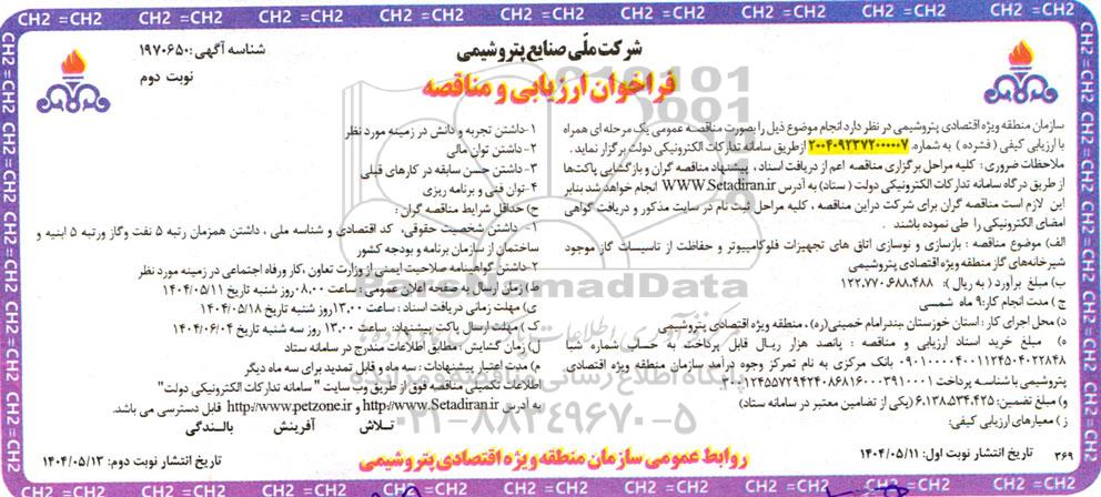 سازمان منطقه ویژه اقتصادی پتروشیمی در نظر دارد انجام موضوع ذیل را بصورت مناقصه عمومی یک مرحله ای همراه با ارزیابی کیفی (فشرده) به شماره 2004092372000007 از طریق سامانه تدارکات الکترونیکی دولت برگزار نماید.
