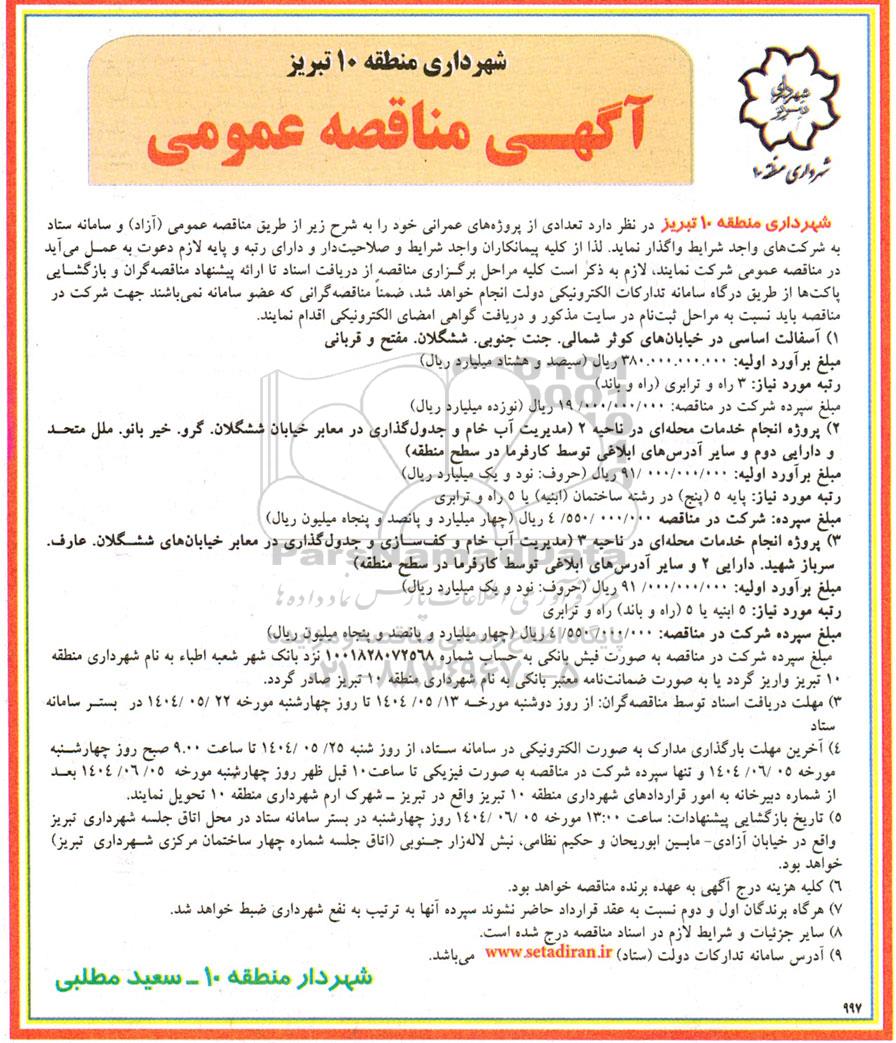 شهرداری منطقه 10 تبریز در نظر دارد تعدادی از پروژه های عمرانی خود را به شرح زیر از طریق مناقصه عمومی (آزاد) و سامانه ستاد به شرکتهای واجد شرایط واگذار نماید. لذا از کلیه پیمانکاران واجد شرایط و صلاحیت دار و دارای رتبه و پایه لازم دعوت به عمل می آید در مناقصه عمومی شرکت نمایند لازم بذکر است کلیه مراحل برگزاری مناقصه از دریافت اسناد تا ارائه پیشنهاد مناقصه گران و بازگشایی پاکتها از طریق درگاه سامانه ندارکات الکترونیکی دولت انجام خواهد شد. ضمنا مناقصه گرانی که عضو سامانه نمی باشند جهت شرکت در مناقصه باید نسبت به مراحل ثبت نام در سایت مذکور و دریافت گواهی امضای الکترونیکی اقدام نمایند.