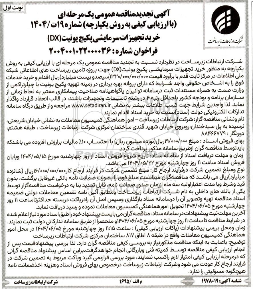 شرکت ارتباطات زیرساخت در نظر دارد نسبت به تجدید مناقصه عمومی یک مرحله ای با ارزیابی کیفی به روش یکپارچه به منظور خرید تجهیزات سرمایشی پکیج یونیت (DX) جهت پروژه تامین زیرساخت های اطلاعاتی شبکه ملی اطلاعات در مرکز ثابت قدم با برآورد قیمت 320.000.000.000 (سیصد و بیست میلیارد) ریال اقدام و خرید خدمات فوق را به اشخاص حقوقی واجد شرایط که دارای پروانه تولید و بهره برداری در زمینه تهویه پکیج یونیت یا چیلر تراکمی از وزارت صمت به همراه مستندات ثبت در سامانه توانیران یا گواهینامه صلاحیت پیمانکاری معتبر به لحاظ زمانی از سازمان برنامه و بودجه کشور با حداقل رتبه 4 در رشته تاسیسات و تجهیزات باشند در قالب انعقاد قرارداد واگذار نماید. لذا واجدین شرایط جهت کسب اطلاعات بیشتر به نشانی ستاد ایران مراجعه و از طریق درگاه سامانه تدارکات الکترونیکی دولت (ستاد) نسبت به خرید اسناد اقدام نمایند.