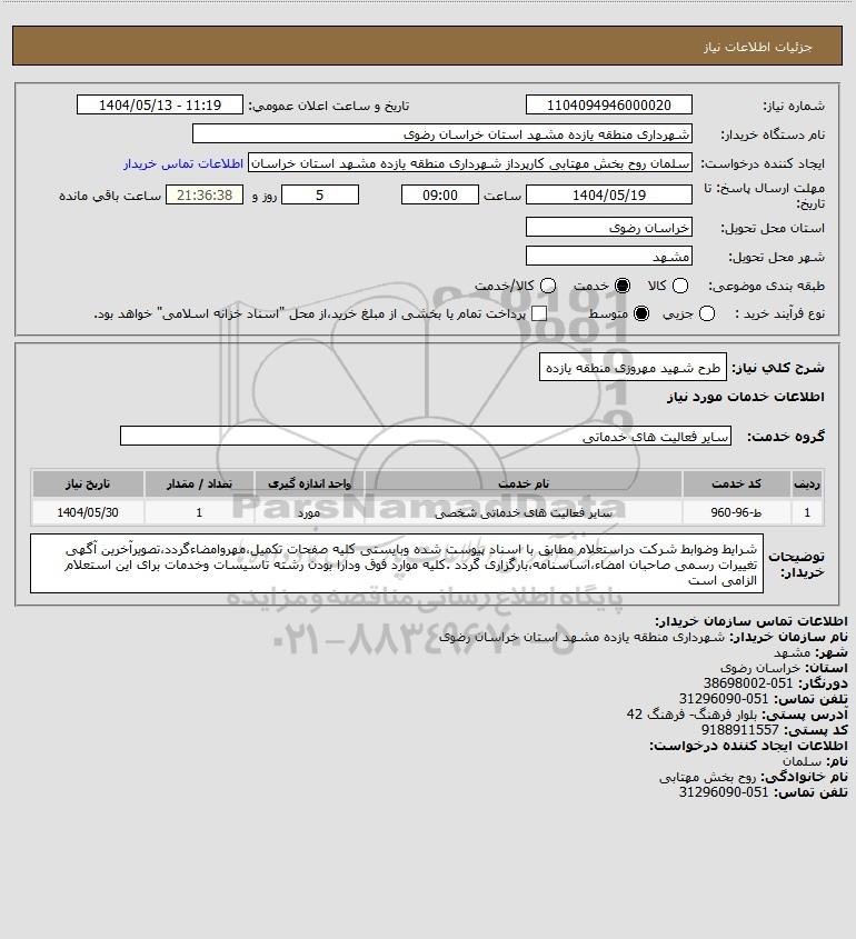 نام سازمان خریدار: شهرداری منطقه یازده مشهد استان خراسان رضوی