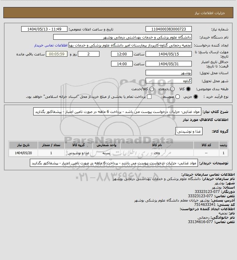 توضیحات خریدار:مواد غذایی- جزئیات درخواست پیوست می باشد - پرداخت 6 ماهه در صورت تامین اعتبار - پیشفاکتور بگذارید