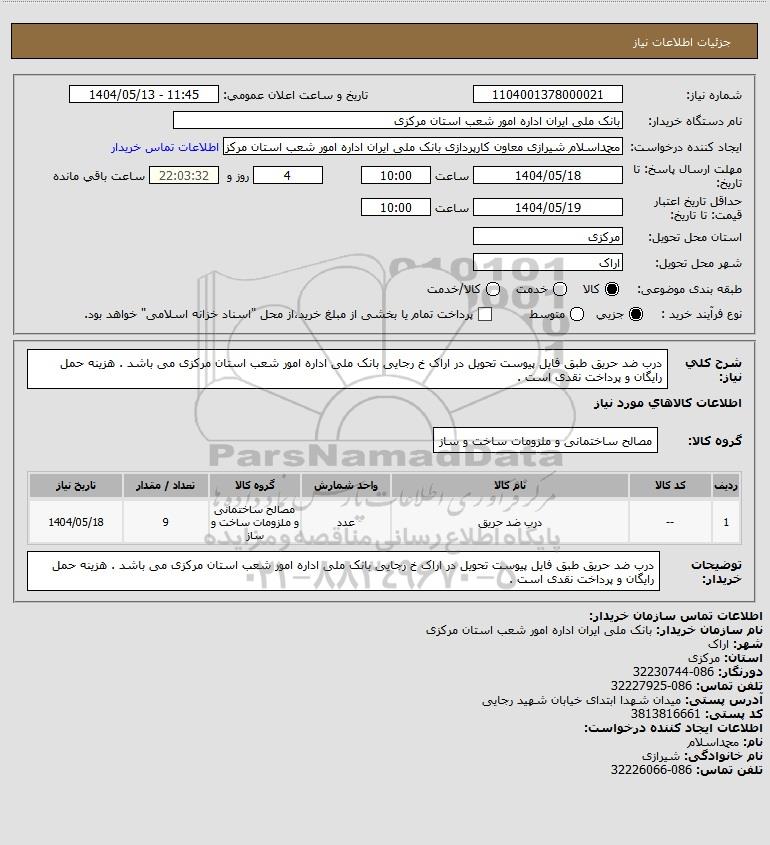 شرح کلی نیاز: درب ضد حریق طبق فایل پیوست تحویل در اراک خ رجایی بانک ملی اداره امور شعب استان مرکزی می باشد . هزینه حمل رایگان و پرداخت نقدی است .