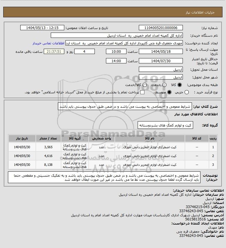 | 3 | -- | کیت اضطراری لوازم التحریر دانش آموزی | عدد | کیت و لوازم کمک های بشردوستانه | 8,138 | 1404/05/30 |