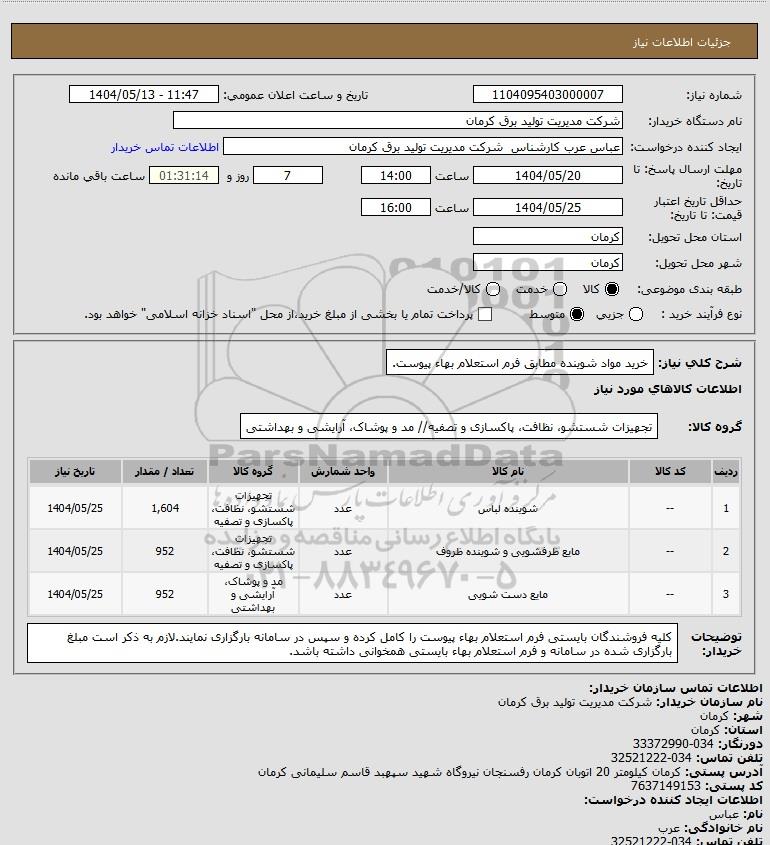 استعلام خرید مواد شوینده مطابق فرم استعلام بهاء پیوست., استعلام خرید مواد شوینده مطابق فرم استعلام بهاء پیوست.